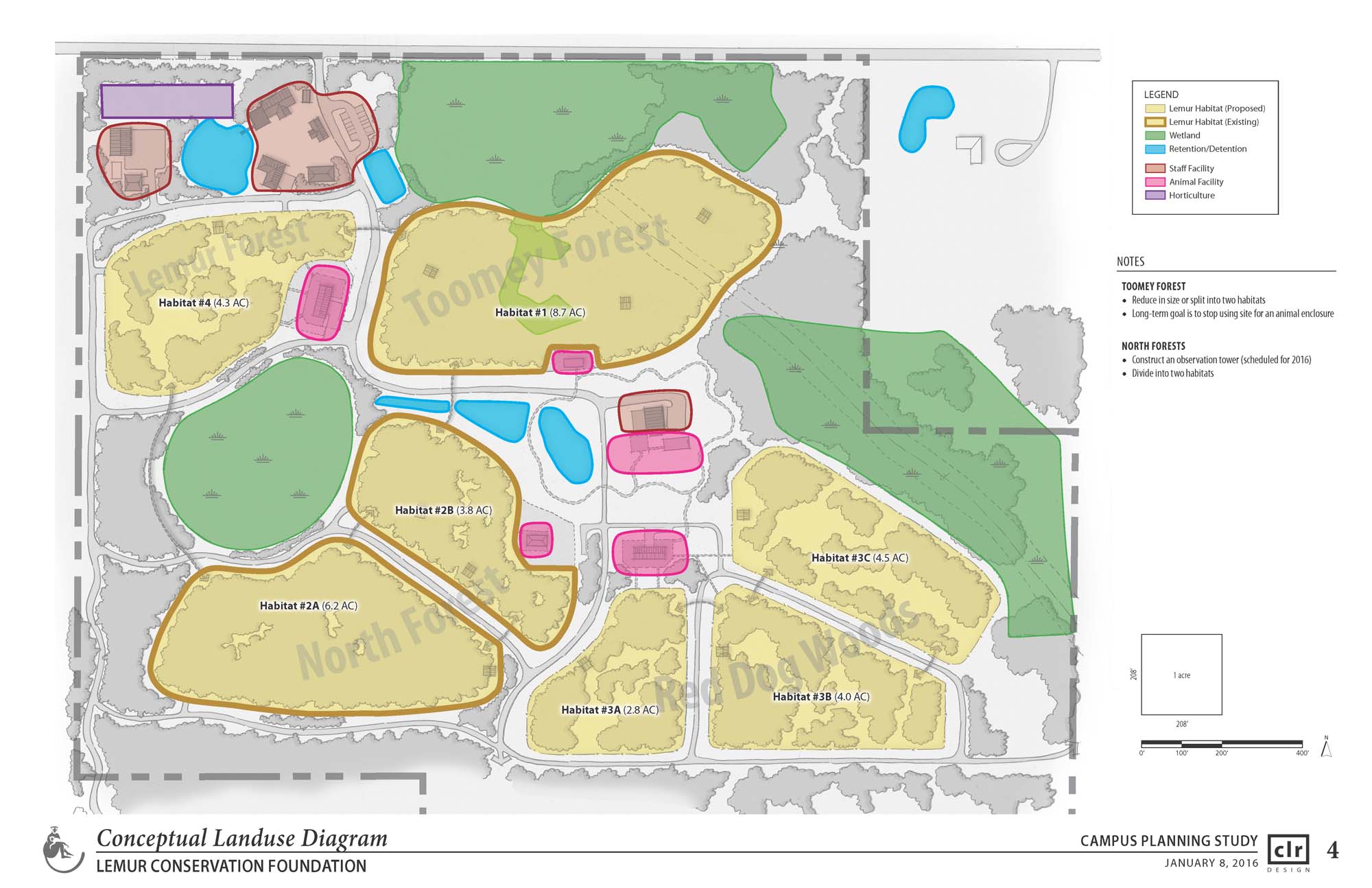 For this Campus Planning Study for the Myakka City Lemur Reserve, the Lemur Conservation Foundation (LCF) and CLR focused on habitat modifications, new habitats, a new clinic and quarantine building, and several other site and infrastructure projects. The team developed a preliminary program for the building and, based on that work, CLR created a building floor plan, a building section, and an artist’s birds-eye perspective illustration that can be used by LCF for fundraising and preliminary cost estimating.