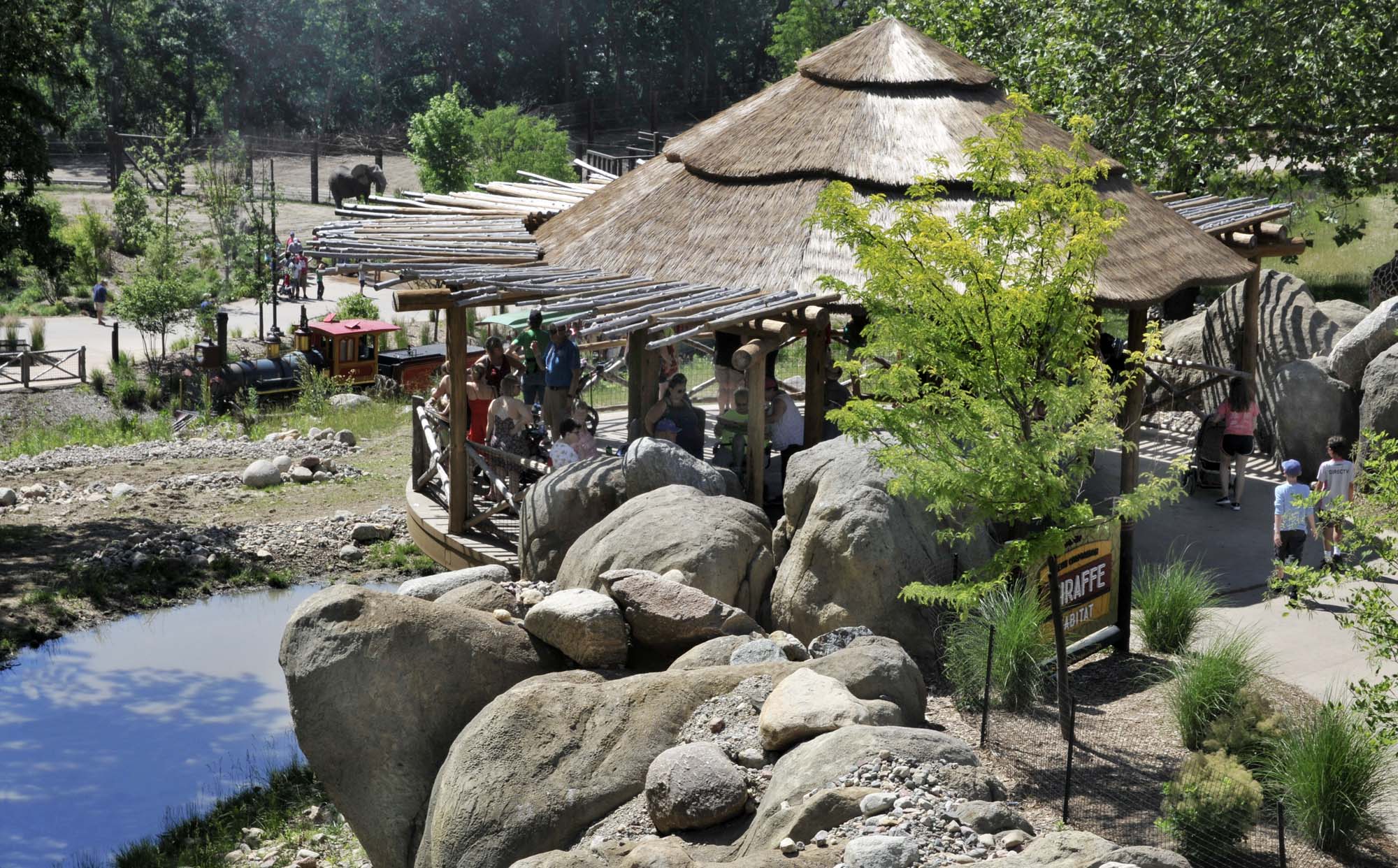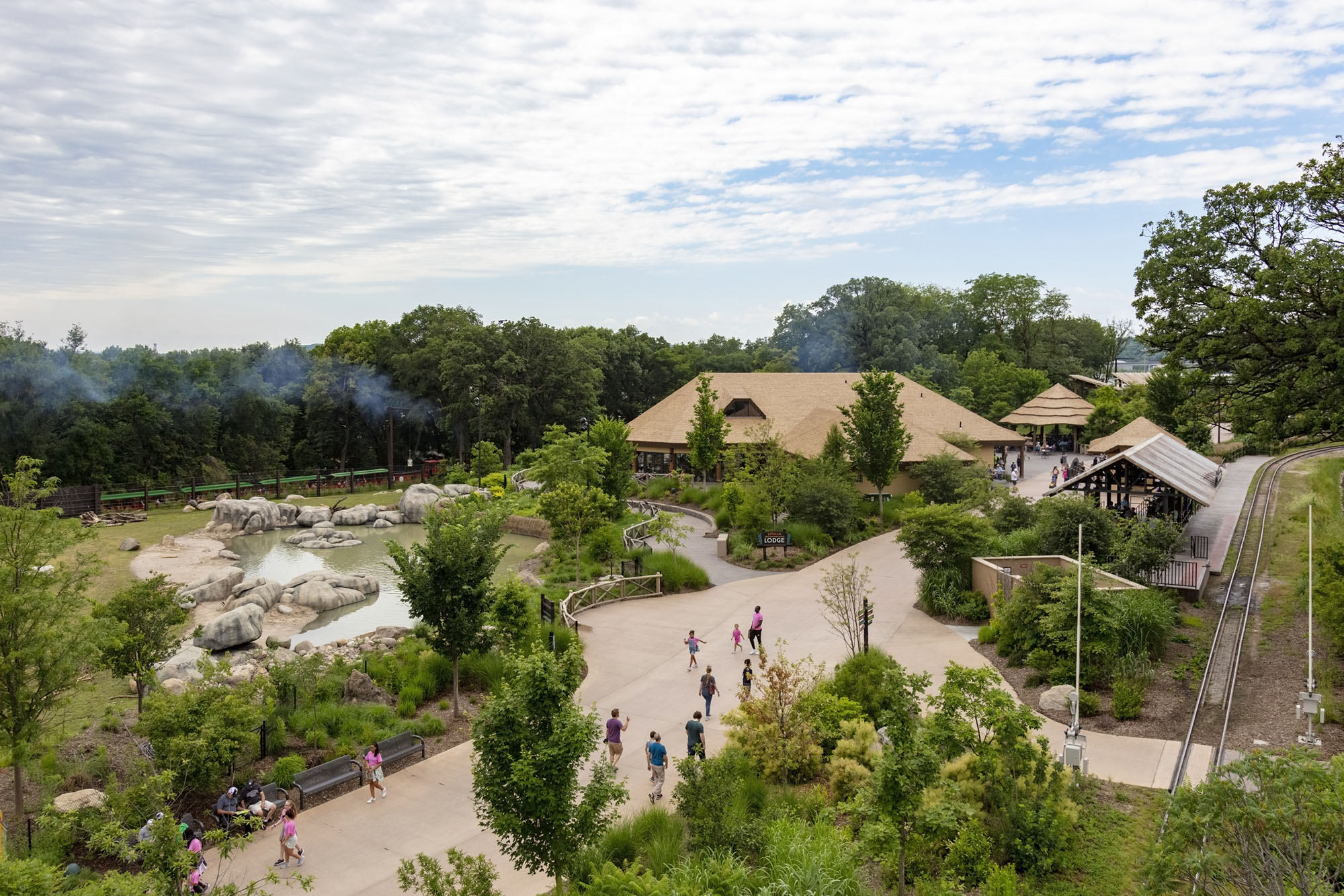 A new “Safari Lodge” serves as a hub for visitor services, including food & beverage and restrooms, and provides indoor and outdoor seating with spectacular panoramic views of the elephant water-hole and mixed-species habitat beyond. The existing train was redeveloped and rerouted to provide exclusive views of the mixed-species habitats and a new station is located at the center of the Grasslands experience.