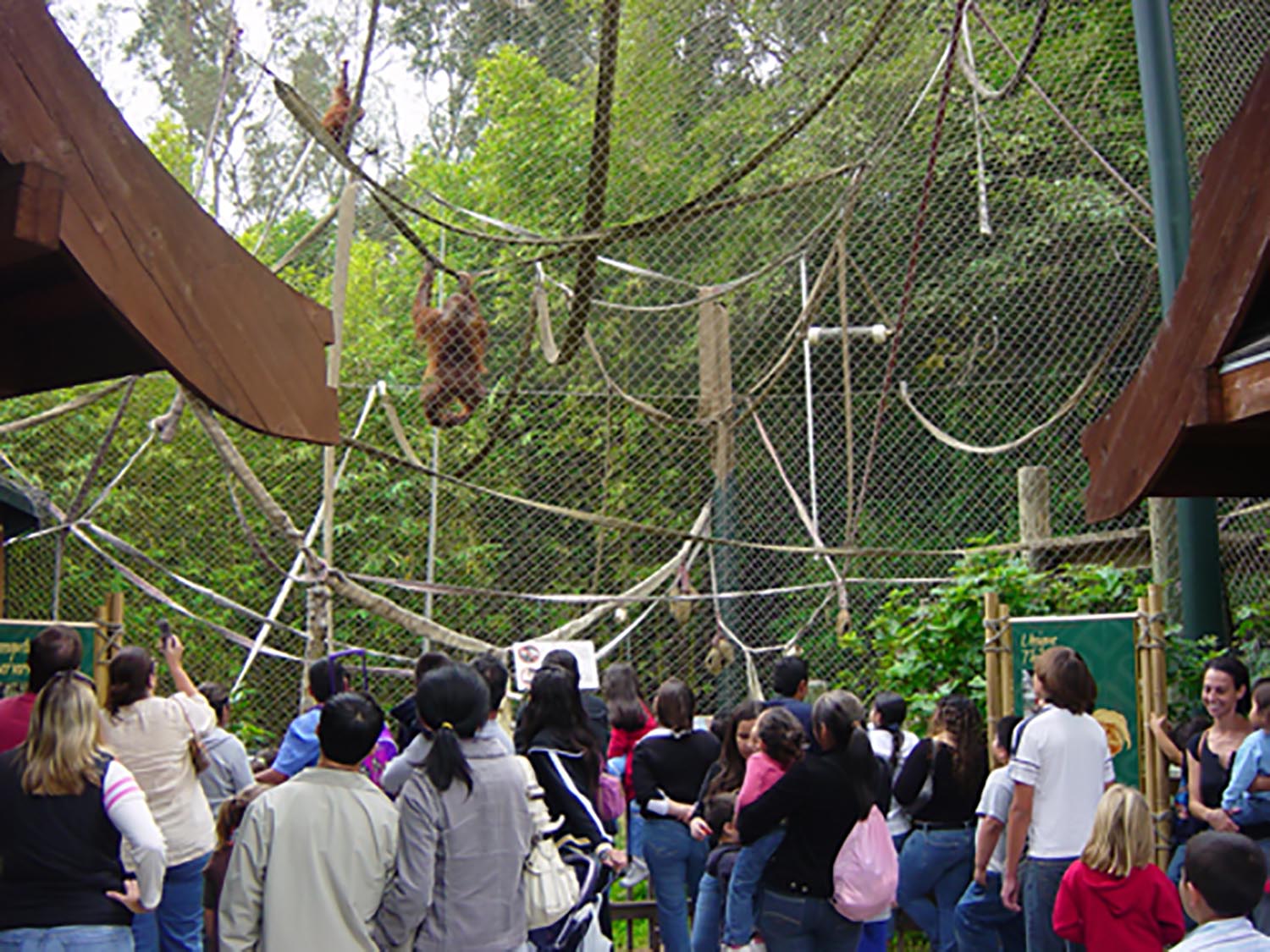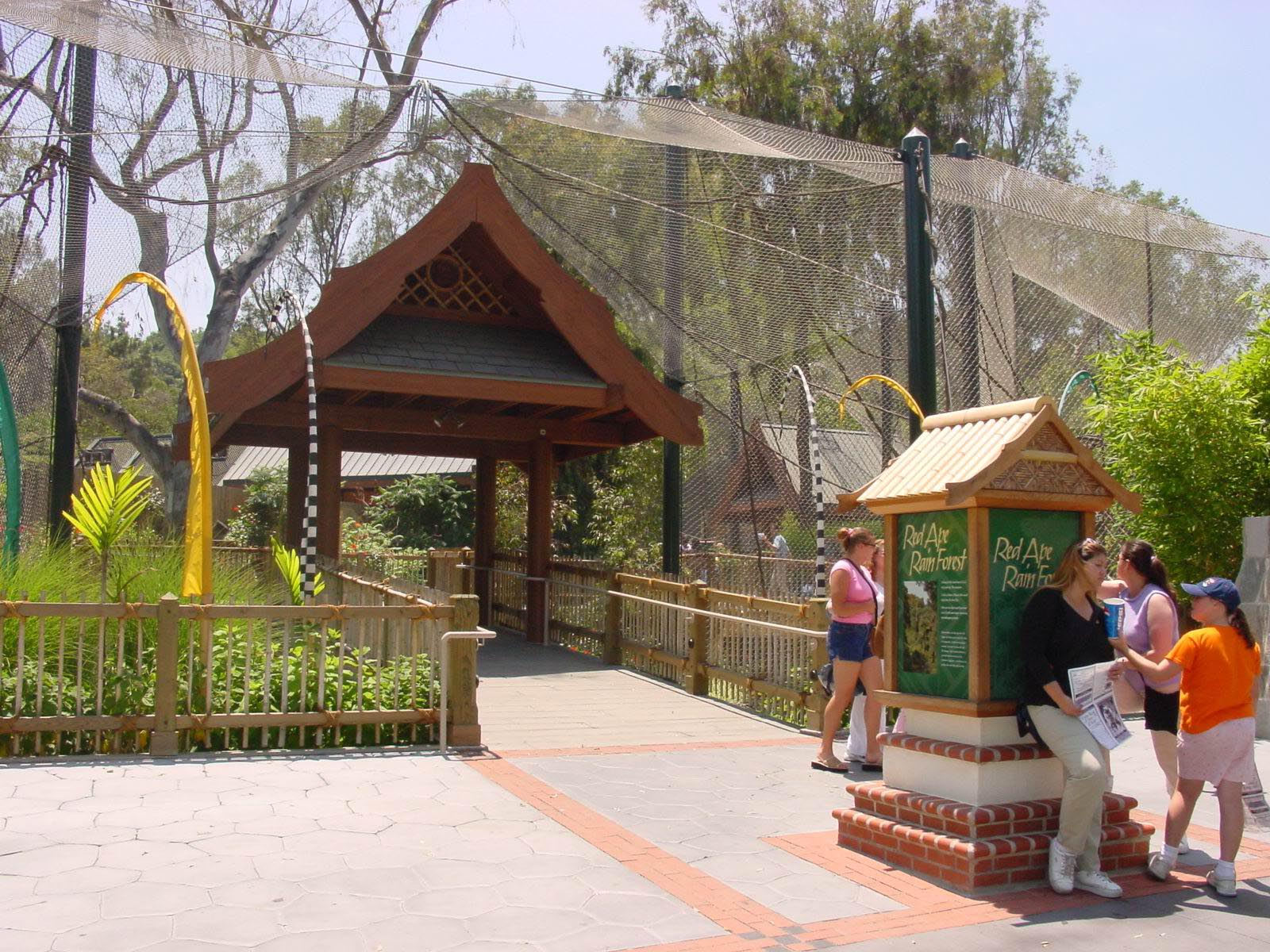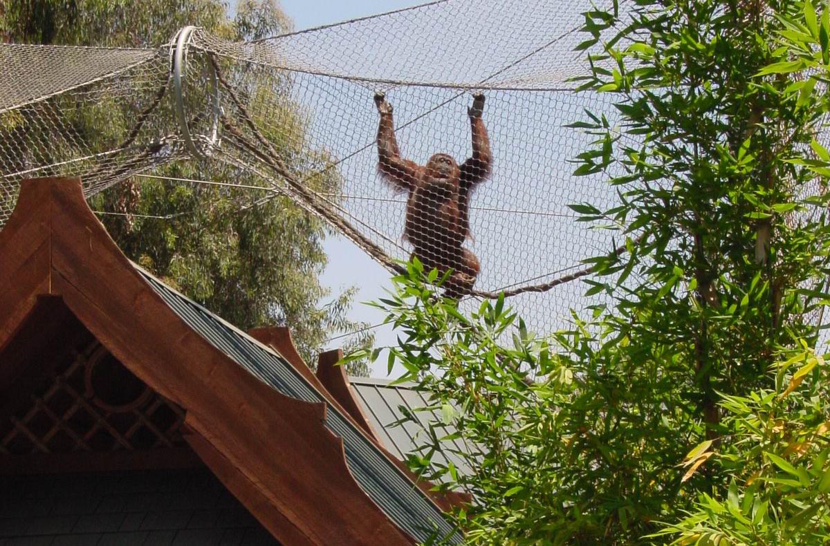 A multi-level tropical exhibit where visitors can walk among orangutans and be immersed in a Southeast Asian rainforest, with flexible mesh linkages that inspired many later exhibits worldwide.