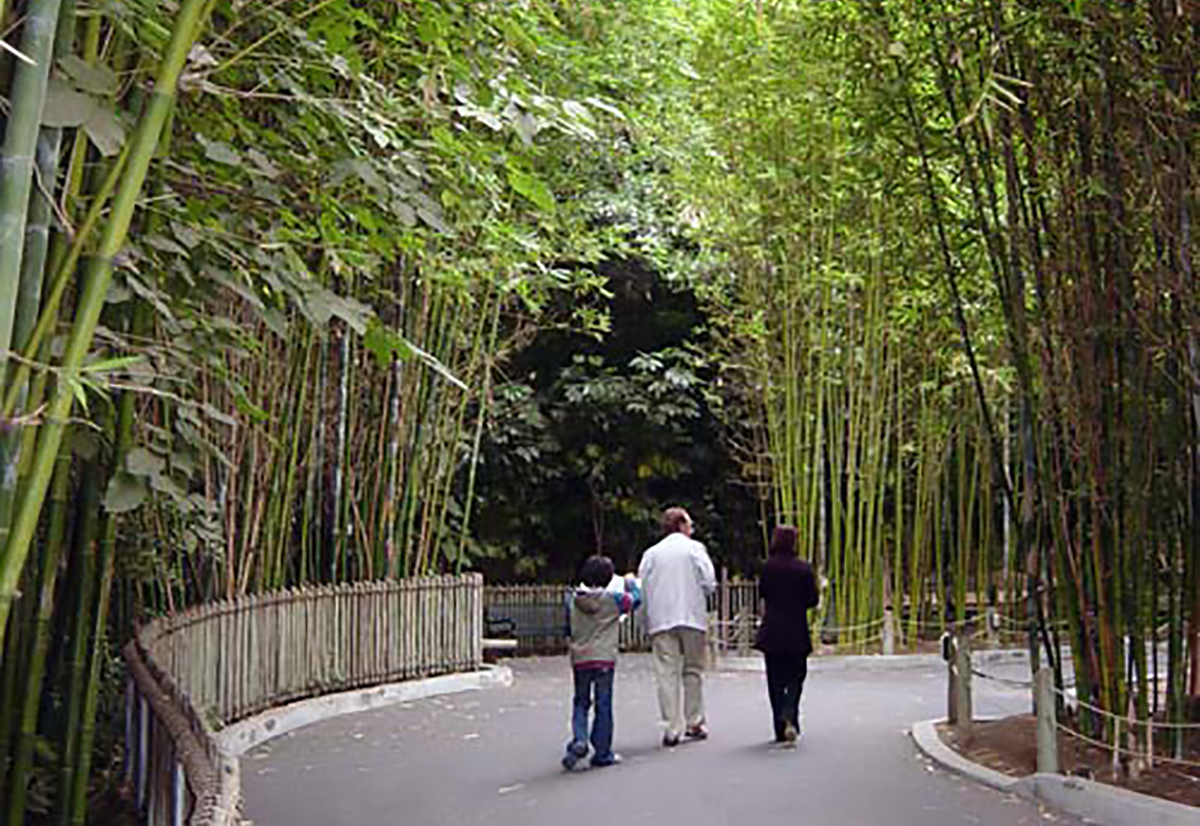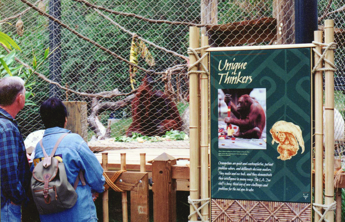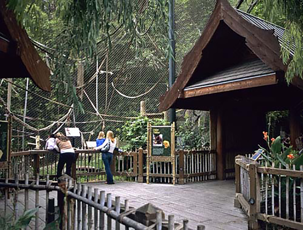 This multi-level tropical habitat allows visitors to walk among orangutans and be immersed in a Southeast Asian rainforest of 20-foot-tall bamboo, fruit, and ficus trees. The main viewing area is a large platform that allows Zoo guests to view these arboreal apes as they climb to canopy level. The layout of the exhibit puts visitors in the center of the exhibit and enables the orangutans to move in a complete circle around the public. The interior spaces and the outdoor exhibit habitats are designed to accommodate flexible options of moving animals into different exhibit spaces or holding areas. If animals need to be separated or if maintenance is being performed, the animal exhibit area can be divided into two separate spaces.